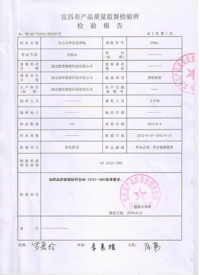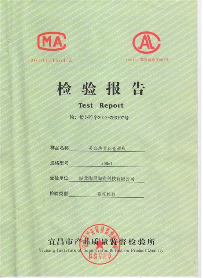 2012關(guān)公坊年青花瓷酒瓶500ml質(zhì)檢報告