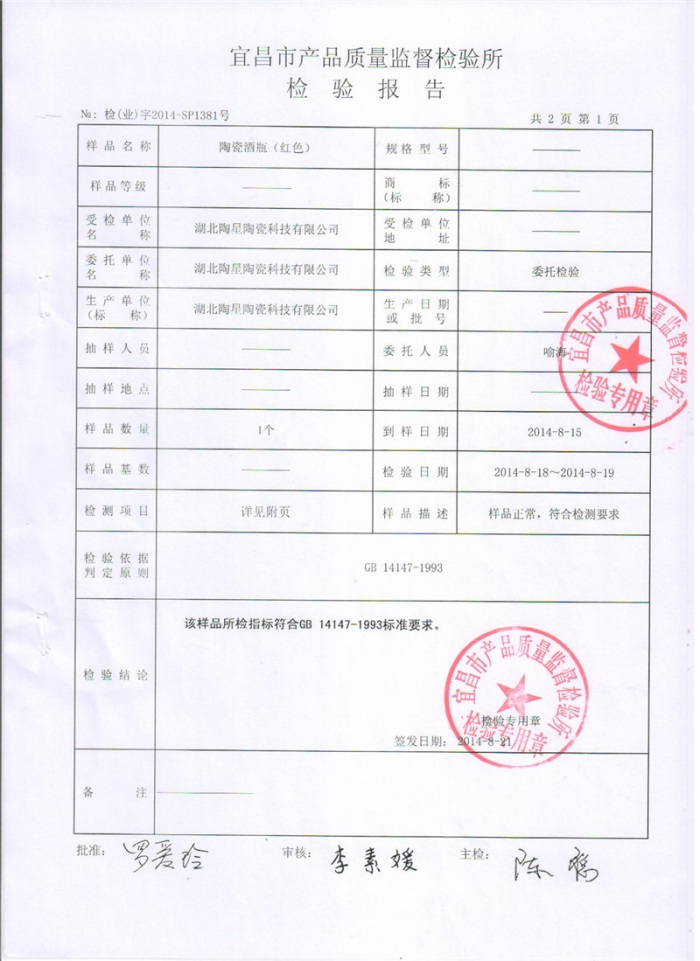 陶瓷酒瓶紅色質(zhì)檢報告